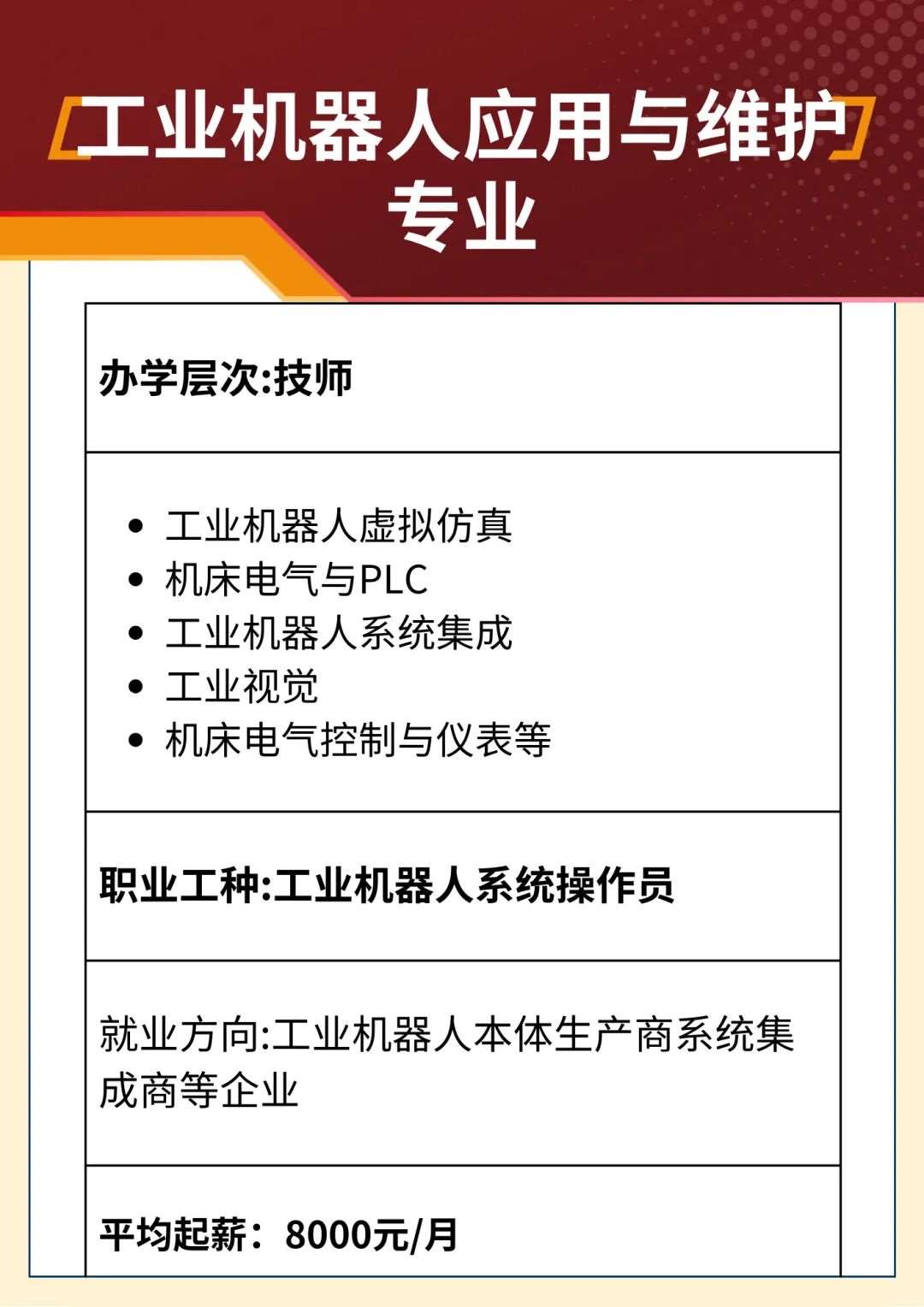 为响应浙江省人社厅《技能促富助力缩小 “三大差距” 行动方案》,契合高技能人才需求,鸿富技加职校与杭州技师学院整合资源,推进未就业大学生技能培养,现开设机器人应用与维修专业大学生技师班,面向专科及以上学历未就业大学生招生。